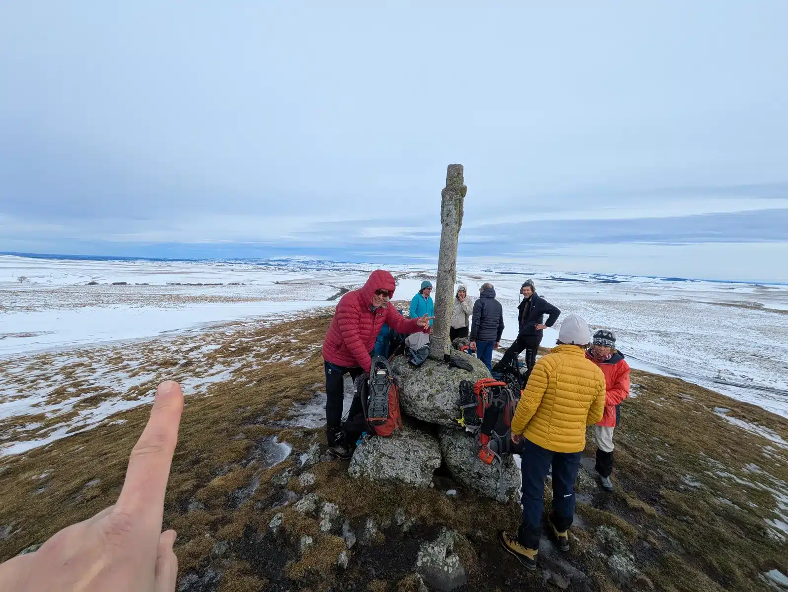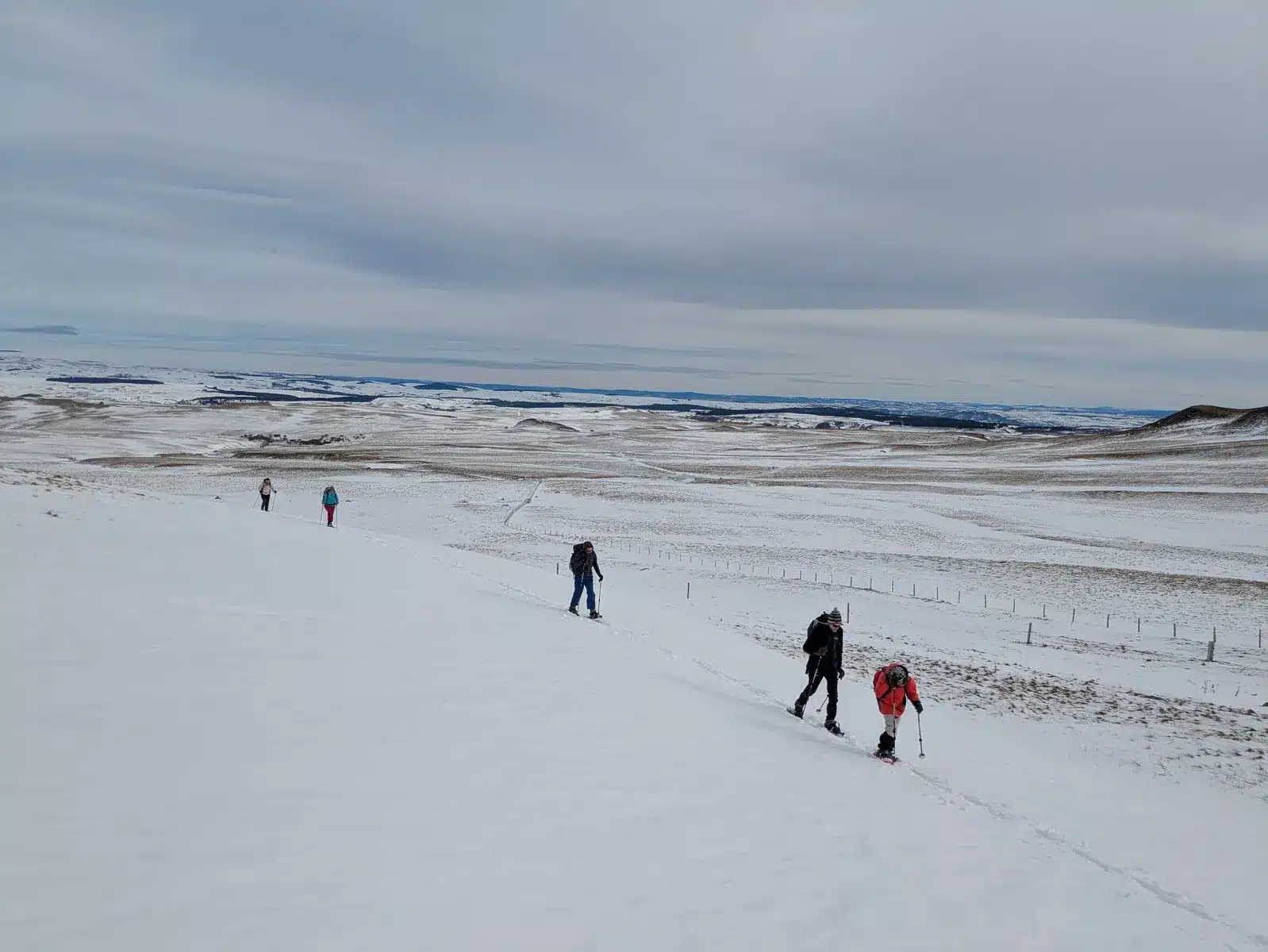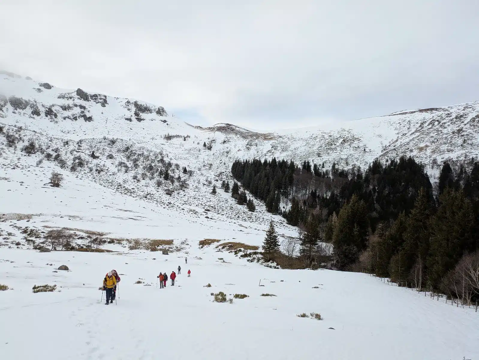 Pour compléter, d’autres visages connus et appréciés en provenance du Sud : les béarnais Nadine et Jean (qui avaient déjà exploré le Cantal avec moi mais en version estivale), HP (rencontré en septembre dernier sur le tour des Écrins) accompagné de son fils Antoine. Lui-même accompagné de sa chienne Vénus.