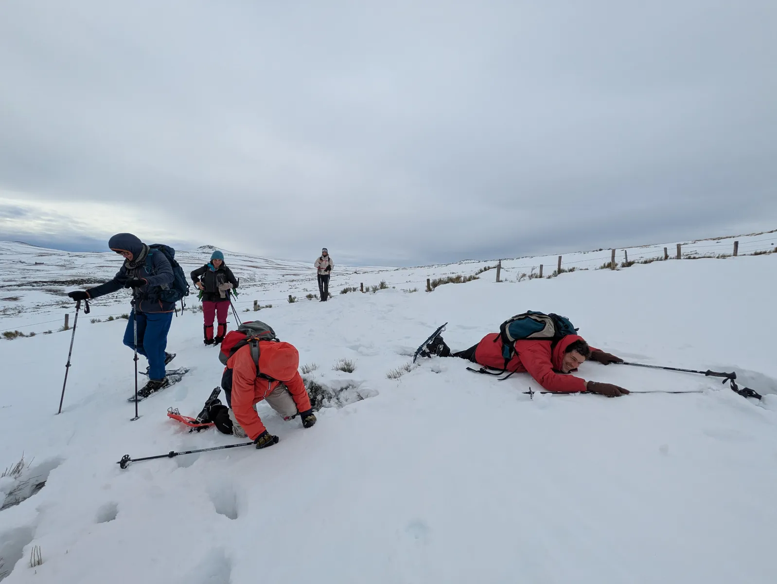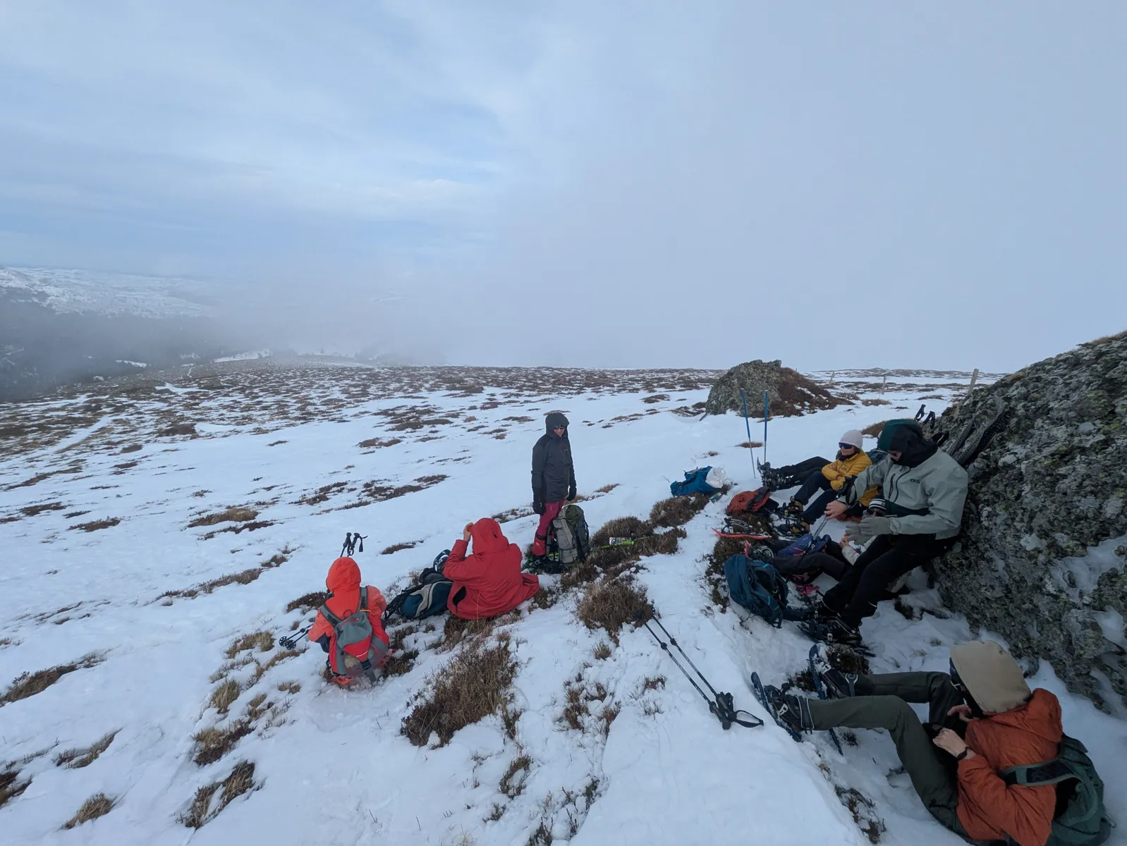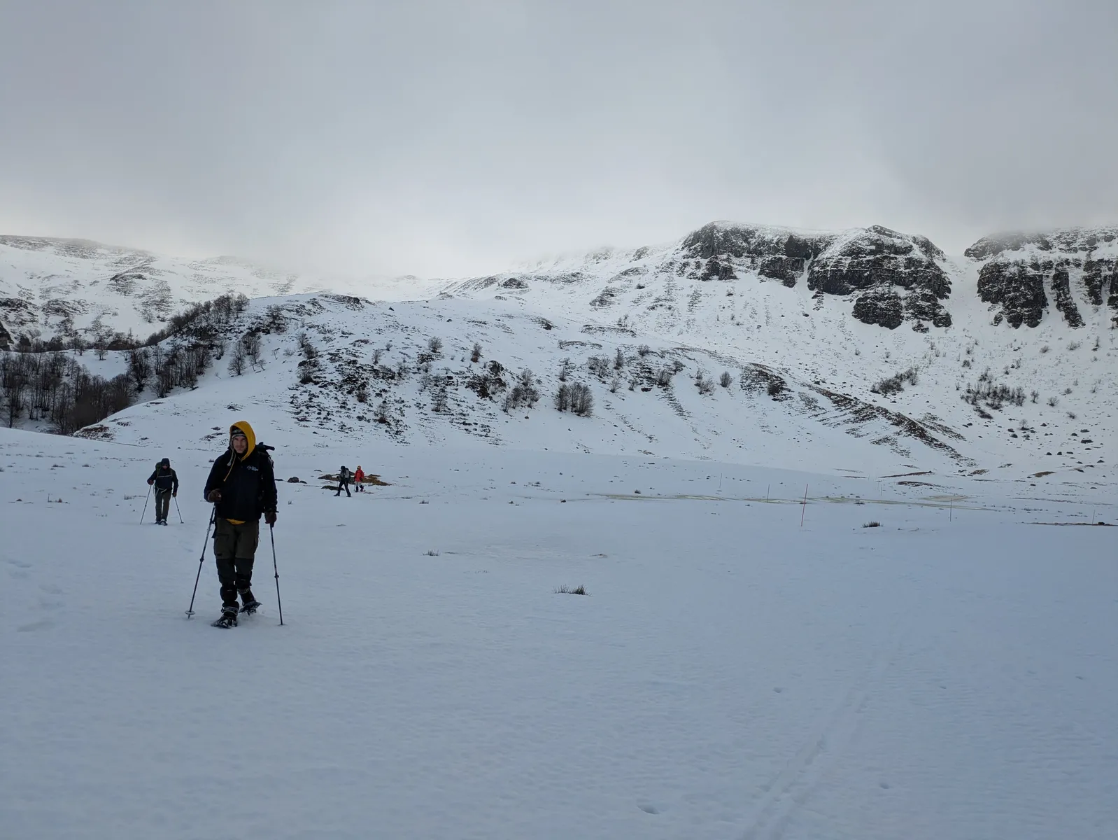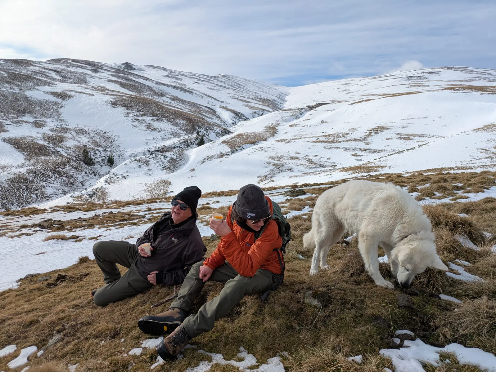Pour compléter, d’autres visages connus et appréciés en provenance du Sud : les béarnais Nadine et Jean (qui avaient déjà exploré le Cantal avec moi mais en version estivale), HP (rencontré en septembre dernier sur le tour des Écrins) accompagné de son fils Antoine. Lui-même accompagné de sa chienne Vénus.
