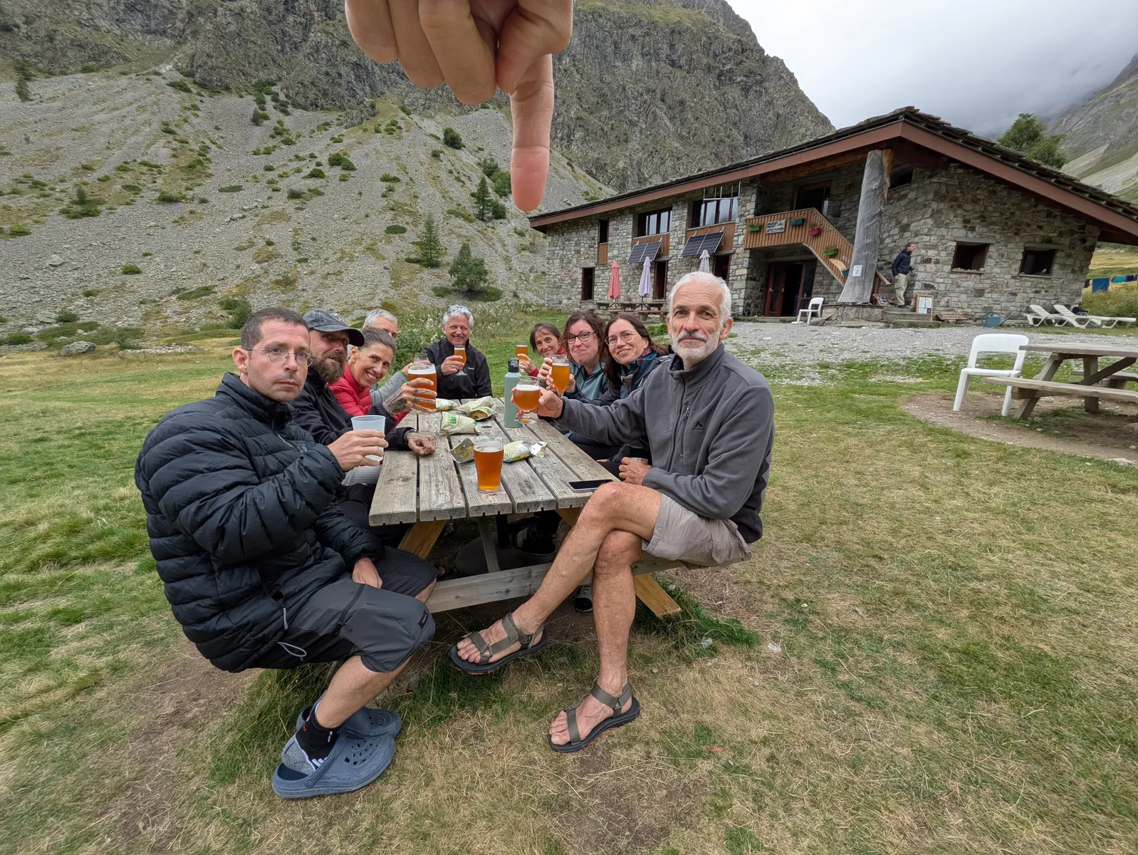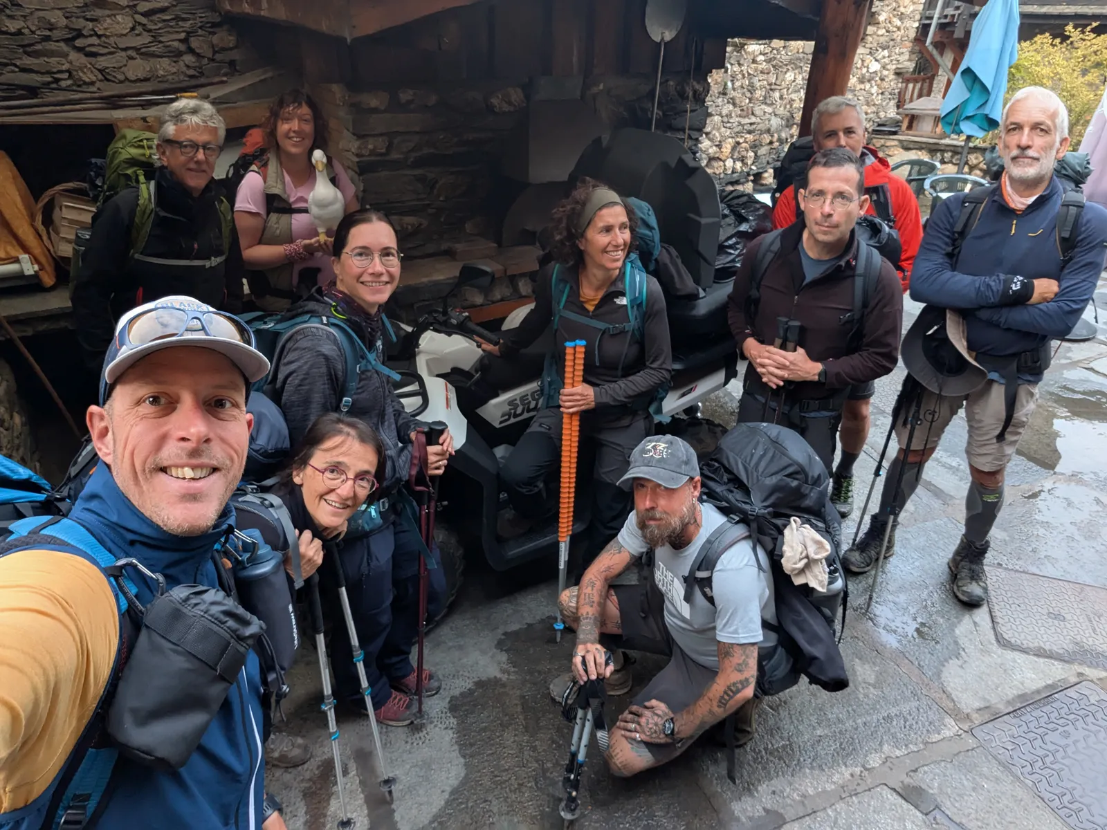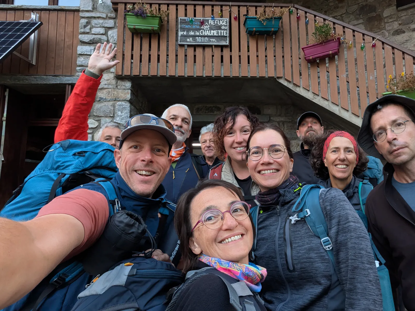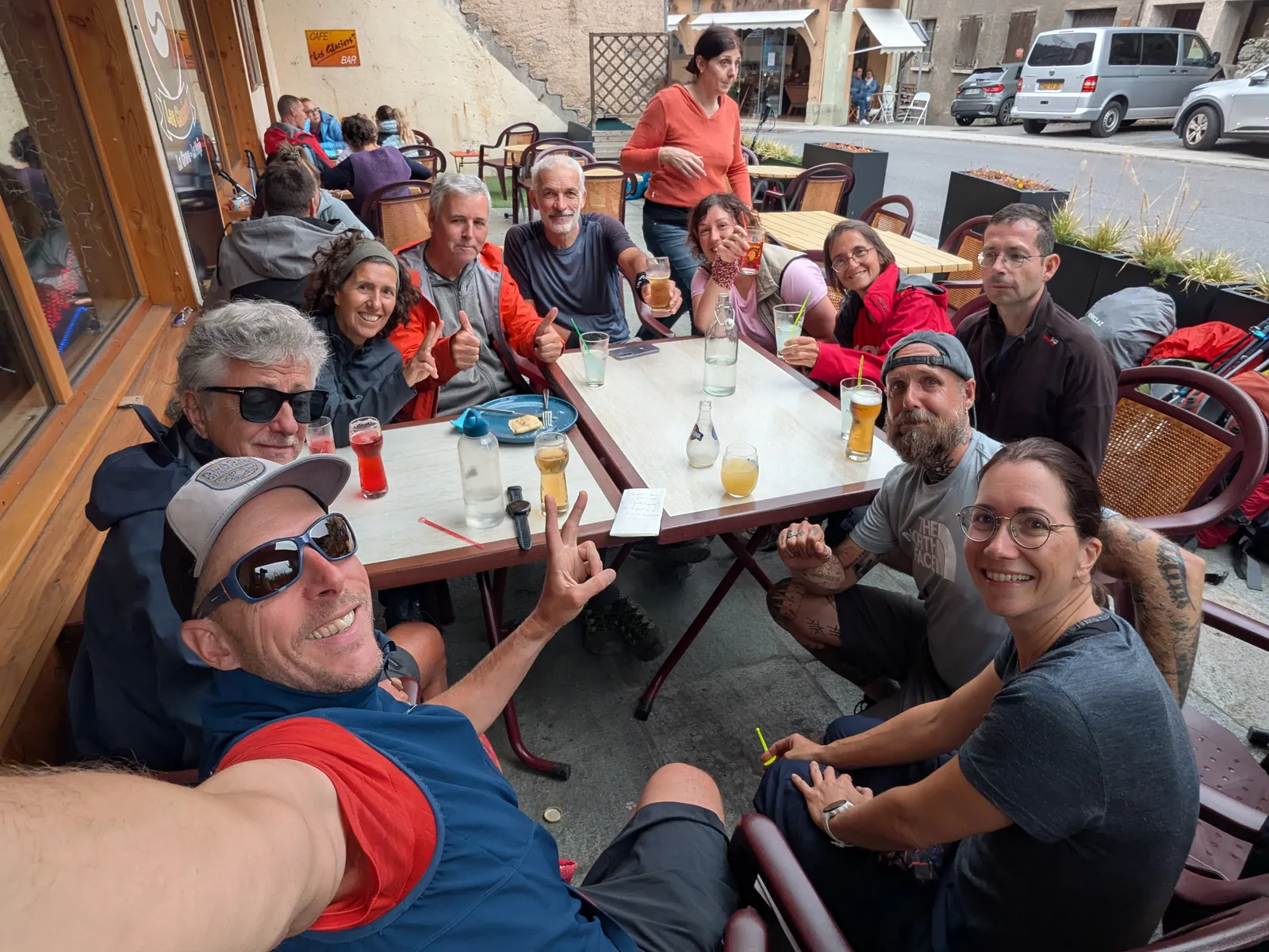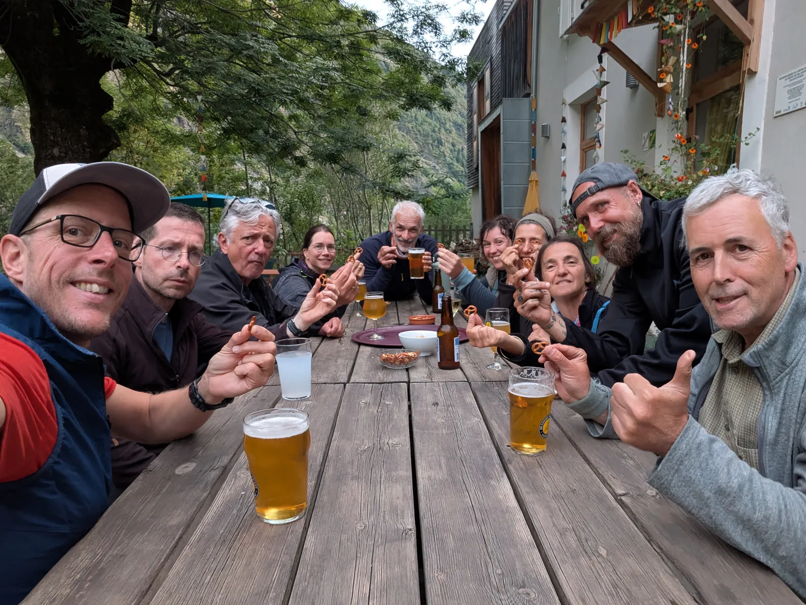 Quelques chiffres aussi pour illustrer notre périple : 9 jours de marche et autant d’hébergements visités, 3.8 kg de bretzels consommés, 170 km parcourus, 112 photos publiées sur le carnet (en ayant déjà fait un énorme tri dans les miennes et sans aller piocher dans celles partagées par certain·e·s hors du groupe WhatsApp), 11000 m gravis (D+), 10 randonneur·euse·s revenus sans encombre (et presque sans courbature ni ampoule 😉) à La Grave !