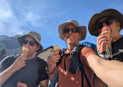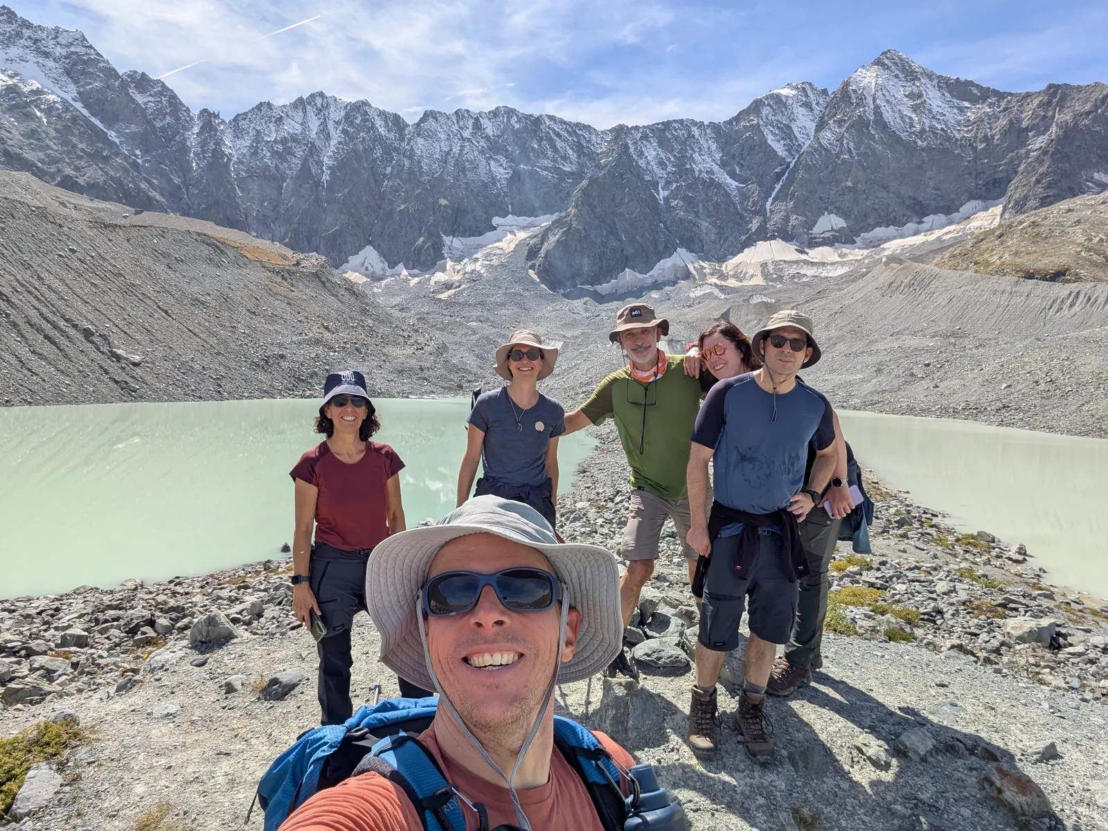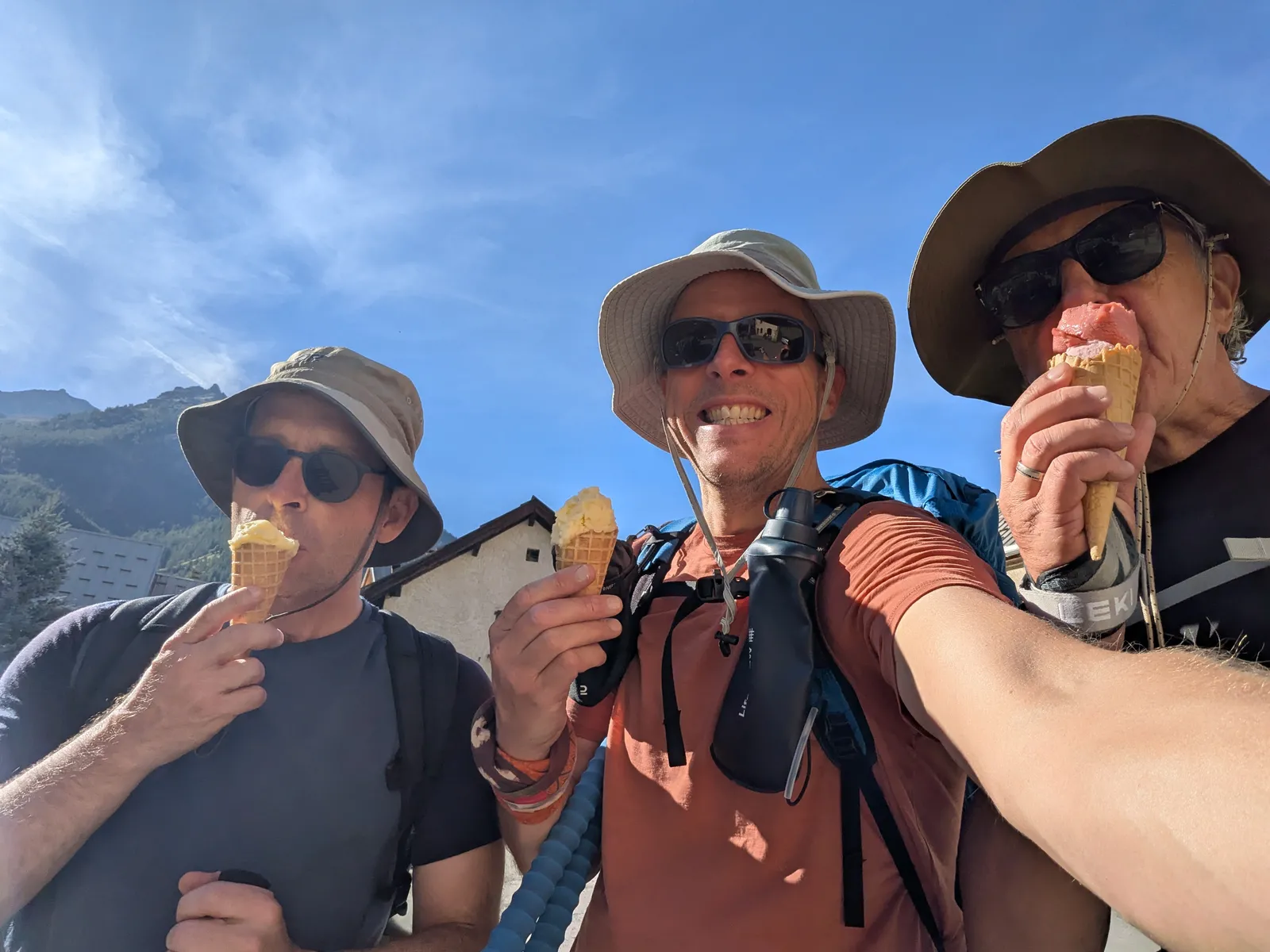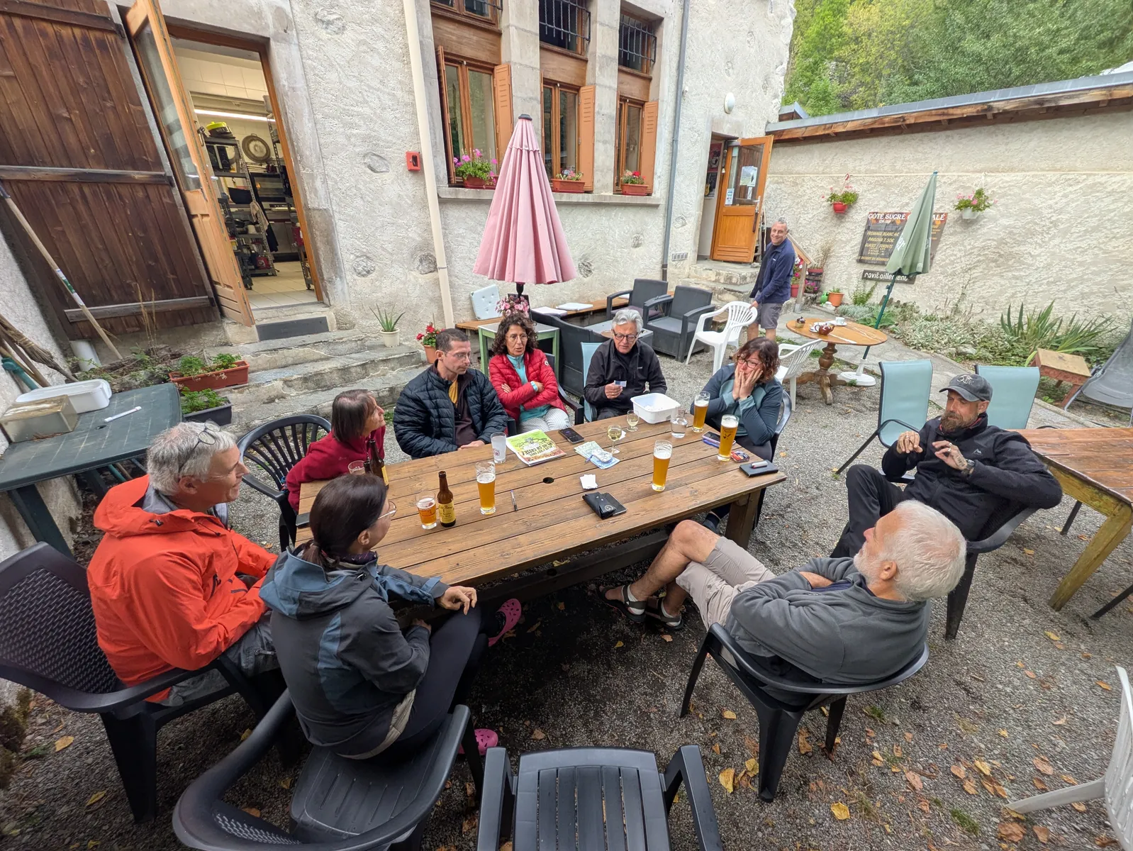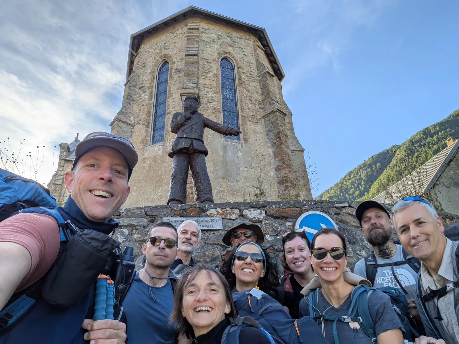 Quelques chiffres aussi pour illustrer notre périple : 9 jours de marche et autant d’hébergements visités, 3.8 kg de bretzels consommés, 170 km parcourus, 112 photos publiées sur le carnet (en ayant déjà fait un énorme tri dans les miennes et sans aller piocher dans celles partagées par certain·e·s hors du groupe WhatsApp), 11000 m gravis (D+), 10 randonneur·euse·s revenus sans encombre (et presque sans courbature ni ampoule 😉) à La Grave !