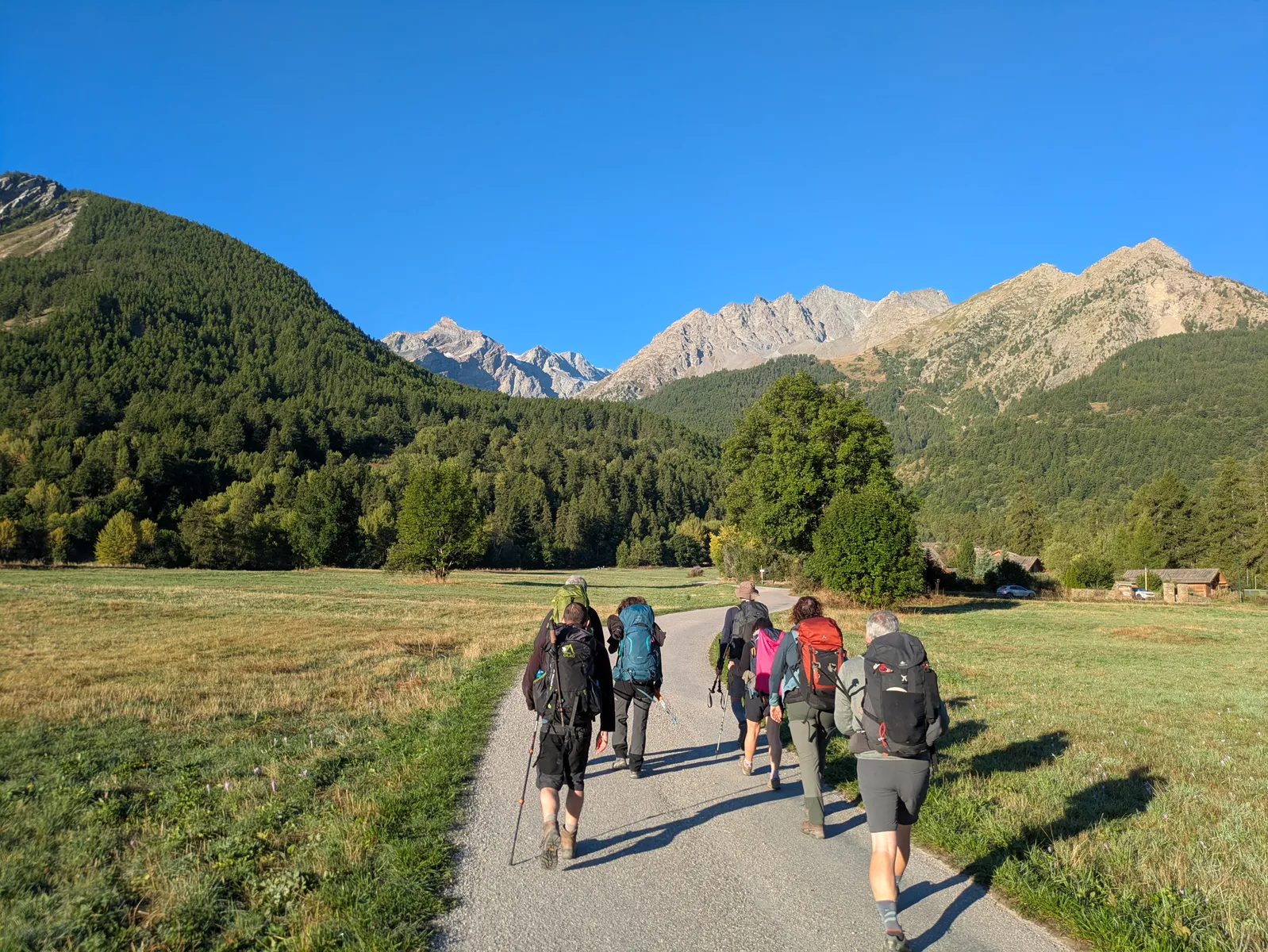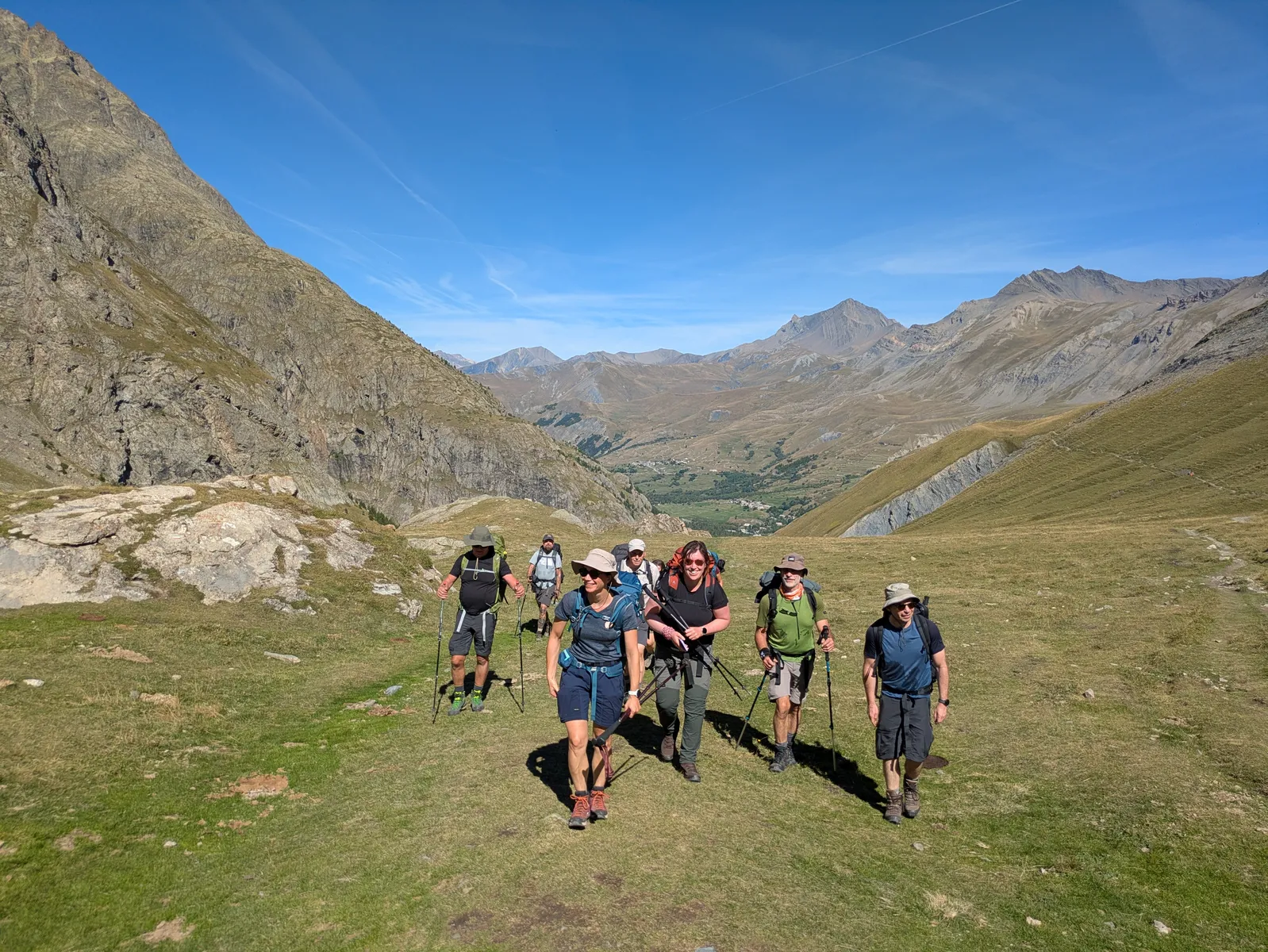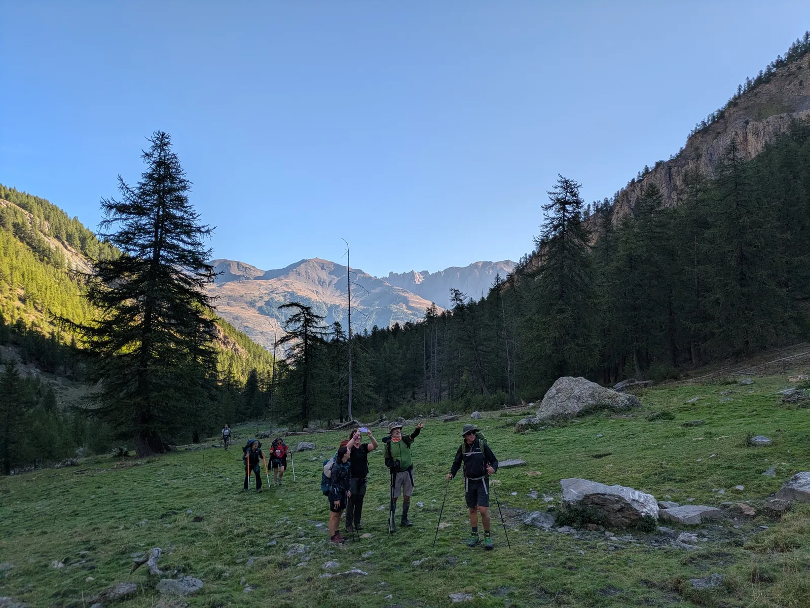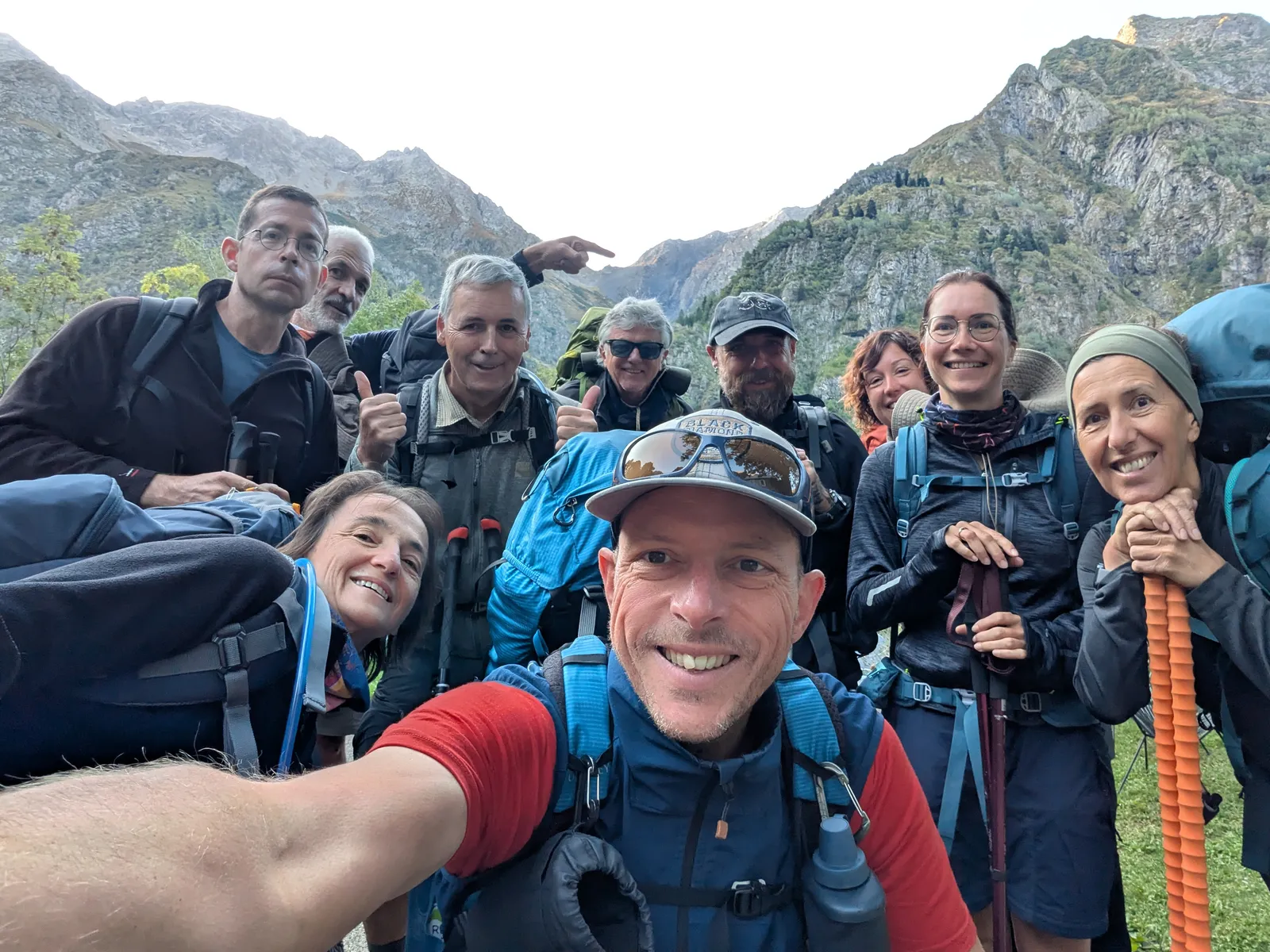 Pour cette grande aventure, je retrouvais déjà une grosse partie de la team Gavarnie 2024 : Aurélie, Céline, Marie-Stéphane, Rémi et Marc. Ayant un peu imaginé ce séjour dans les Écrins pour eux (pensées pour Hortense, Nadine et Claude qui n’ont pu se joindre à nous cette année), je les avais même sollicités en amont lors de sa création et ils avaient tous voté pour la version longue 😀. C’était dire s’ils étaient motivés…