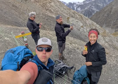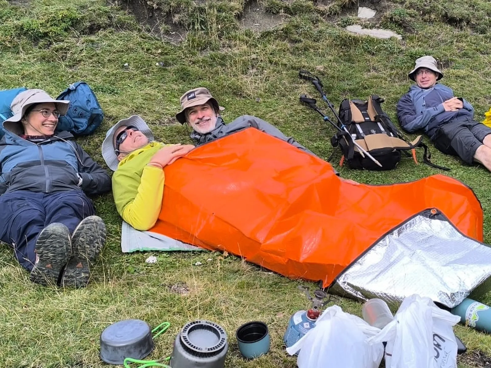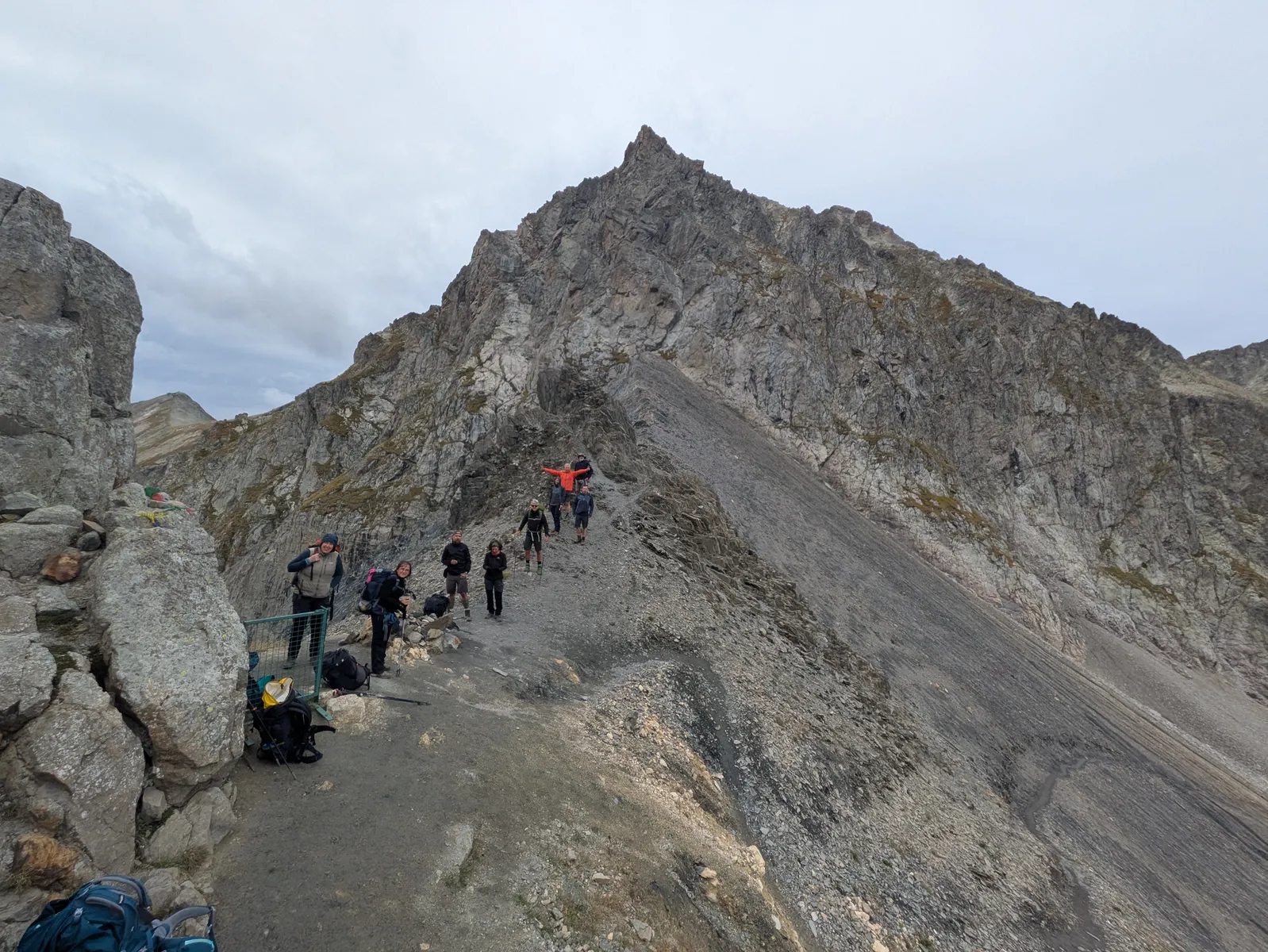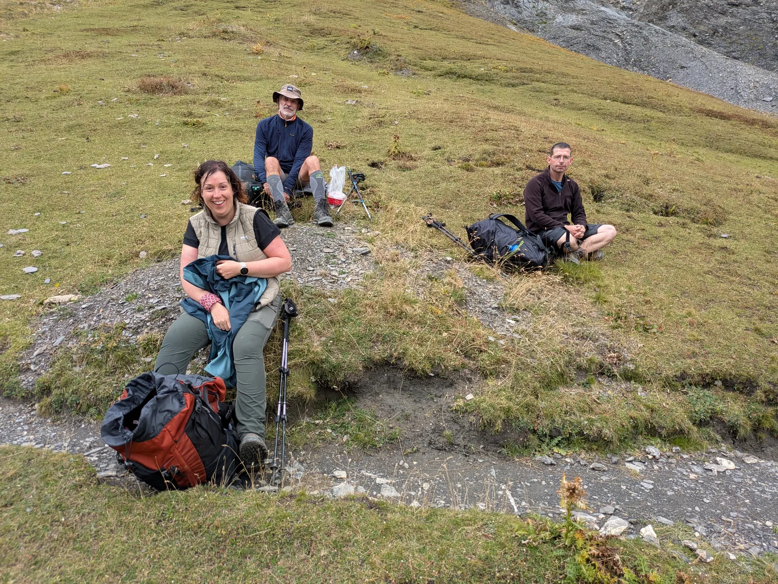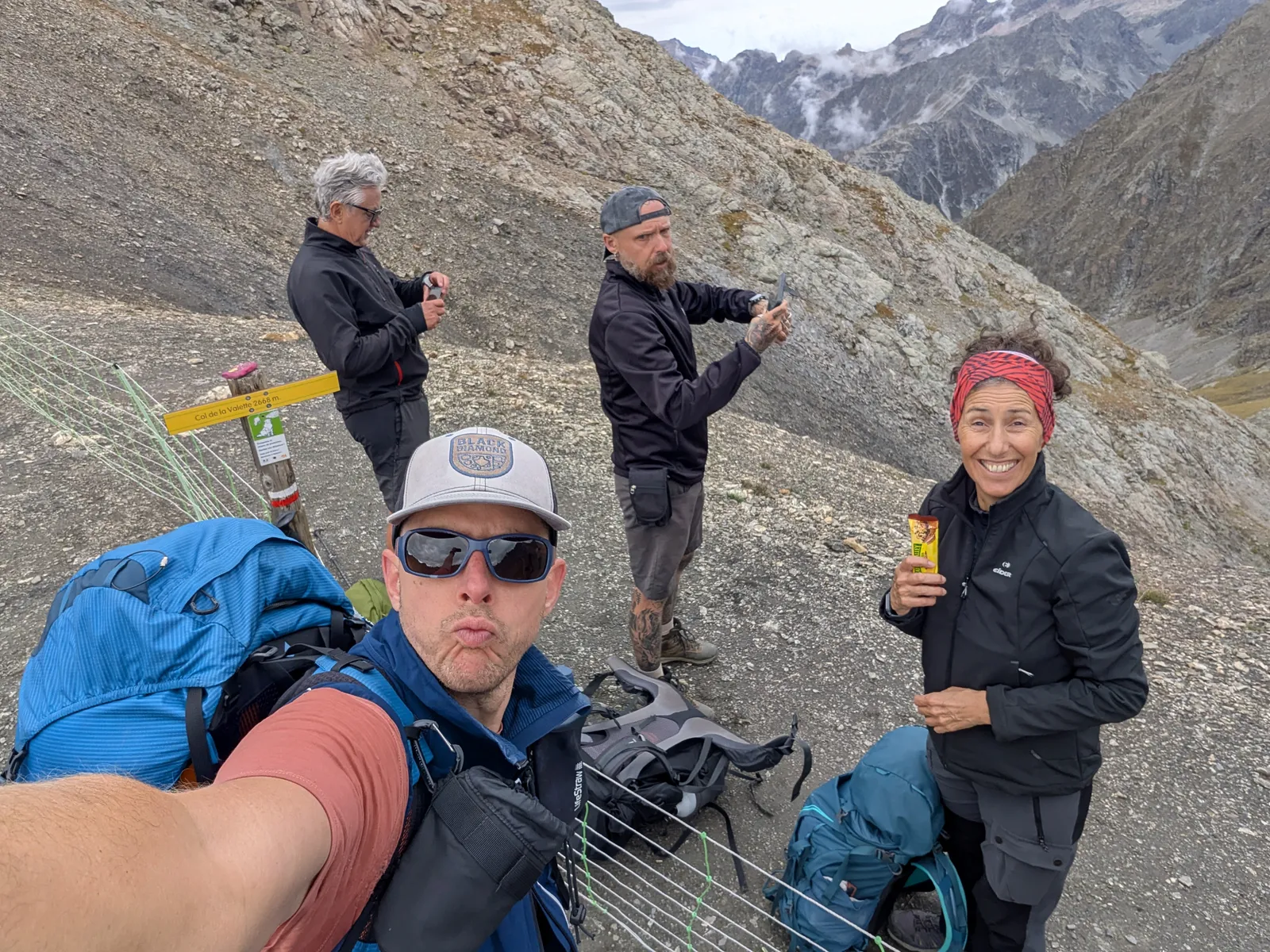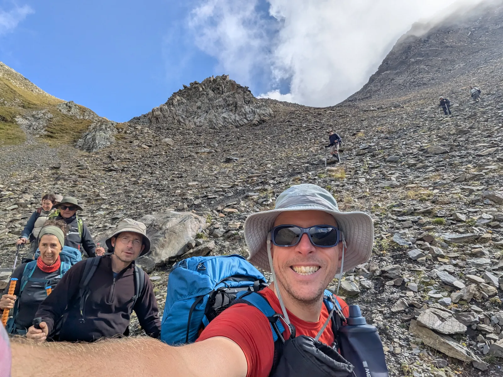 Puis sont venus se greffer au groupe d’autres visages connus que je retrouvais avec grand plaisir. Tout d’abord Lydie qui, après le bel « échauffement » sur le tour du Queyras en 2024, venait découvrir un autre grand massif des Hautes-Alpes. Mais aussi André, décidément insatiable cette année et désireux de se frotter aux Écrins après avoir fait les Encantats en aout dernier. Et donc Matthieu, avec qui j’ai fait (entre autre) la traversée du Néouvielle cet hiver, et qui aura réussi à repartir des Alpes avec ses dix doigts 😋.